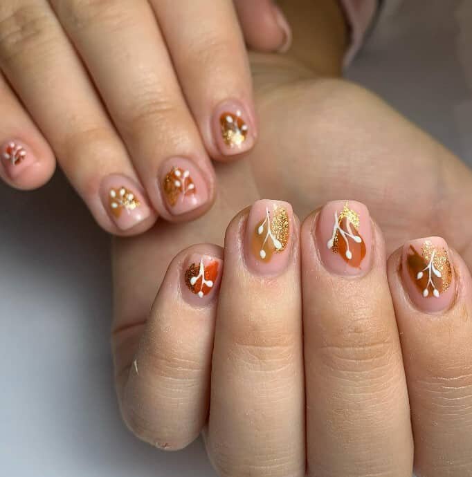 Чарівність цих нігтів нюдового кольору з помаранчевими та золотими плямами, прикрашеними візерунком з білого листя, просто гіпнотизує оточуючих. З таким манікюром ви обов’язково привернете до себе увагу.