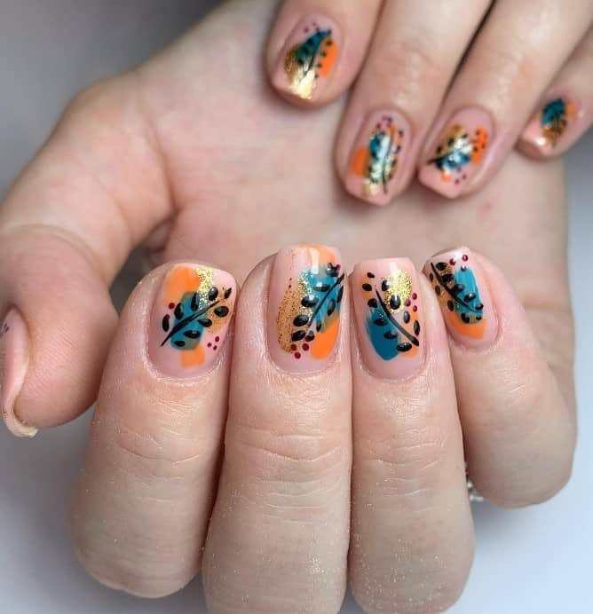 Нанесіть на короткі нігті мандаринові і бірюзові мазки, додайте золотисту блискучу поталь, а зверху намалюйте контрастне чорне листя. Це поєднання яскравих відтінків додасть енергії манікюру.