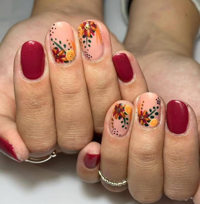 Винні та нюдові нігті з яскраво-жовтими та помаранчевими квітами