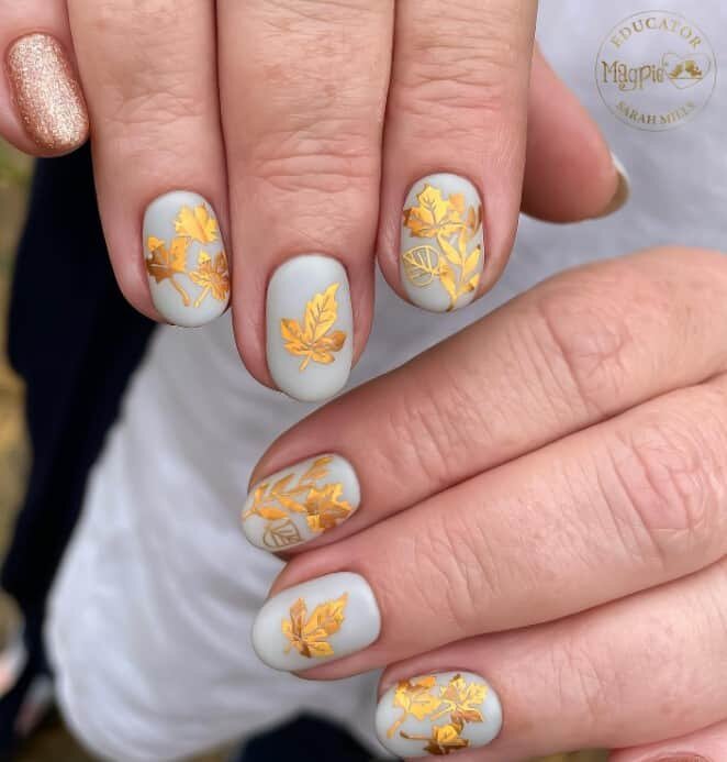 Цей ніжний та жіночний манікюр чистого білого кольору з розкішними акцентами у вигляді золотого кленового листя – найкраща данина красі осені.