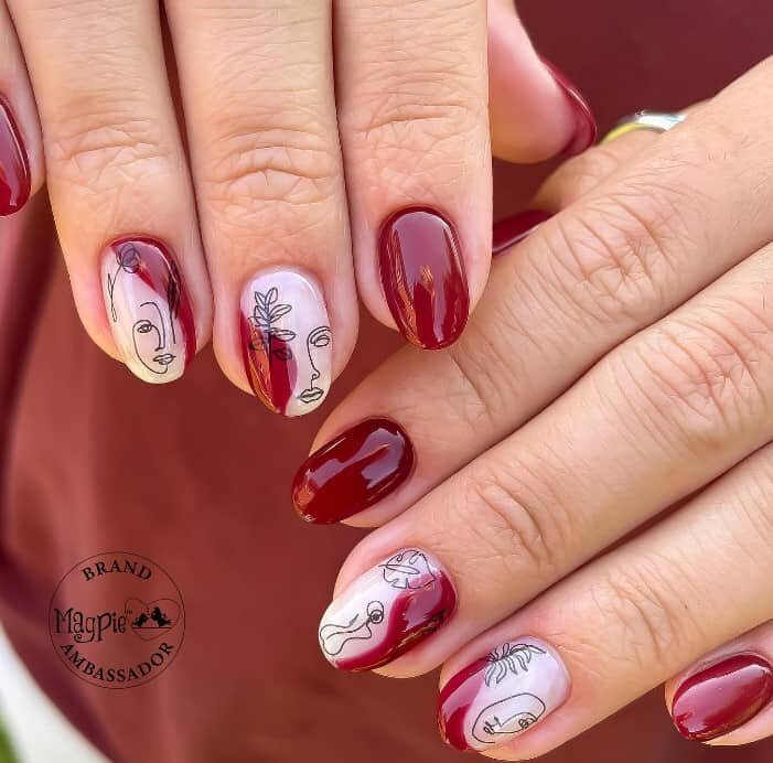 Цей манікюр обов’язково припаде до смаку любителькам всього оригінального. У ньому насичений червоний колір поєднується з мінімалістичними абстрактними малюнками, що зображають жіночі обличчя та листя дерев.