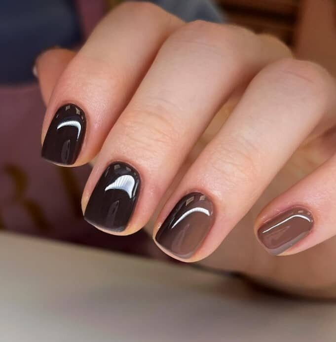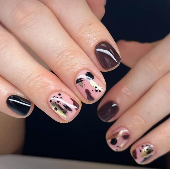 Хто сказав, що темні кольори надто похмурі? У цьому дизайні монотонність чорних і коричневих нігтів розбавлена яскравими акцентами – абстрактними мазками та точками, що надають манікюру теплоти та створюють затишну атмосферу осені.