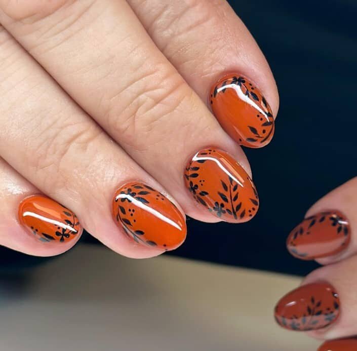 Помаранчеві нігті виглядають життєствердно і енергійно, а витончене чорне листя на кожному нігті створює чарівний контраст з яскравою основою. Цей дизайн нігтів втілює всю красу головного відтінку осені.