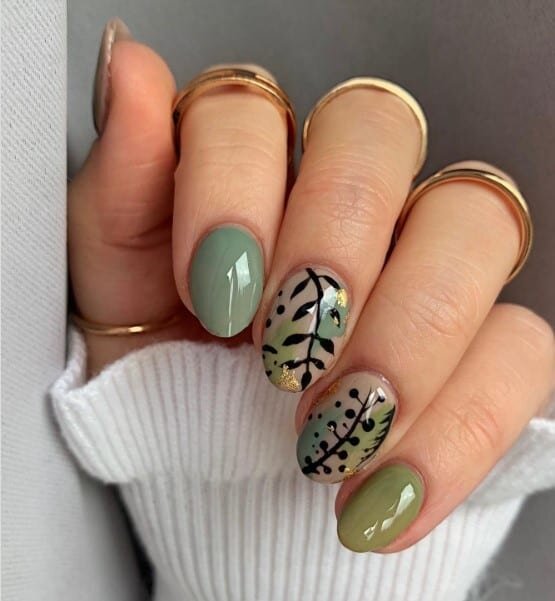 У цьому манікюрі використовуються найкрасивіші відтінки зеленого – оливковий та шавлія. А хитромудрі візерунки з листя, ретельно намальовані на кожному нігті, додають нотку осінньої естетики.