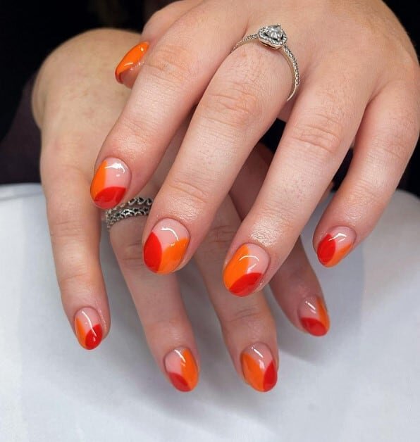 Ці яскраво-жовтогарячі та карамельно-червоні французькі кінчики у формі тюльпану створюють чудовий дизайн з осіннім настроєм. Він виглядає надзвичайно витончено і вишукано навіть на нігтях невеликої довжини.