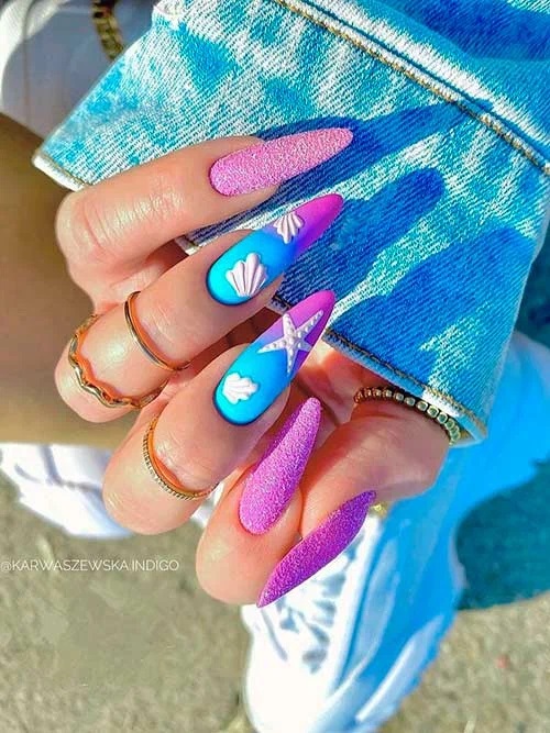 Використовуйте поєднання фіолетового, рожевого та блакитного відтінків з іскристими вкрапленнями блискіток, щоб створити яскравий та елегантний манікюр. Додати до нього літнього настрою допоможуть малюнки перлинних раковин та морських зірок.
