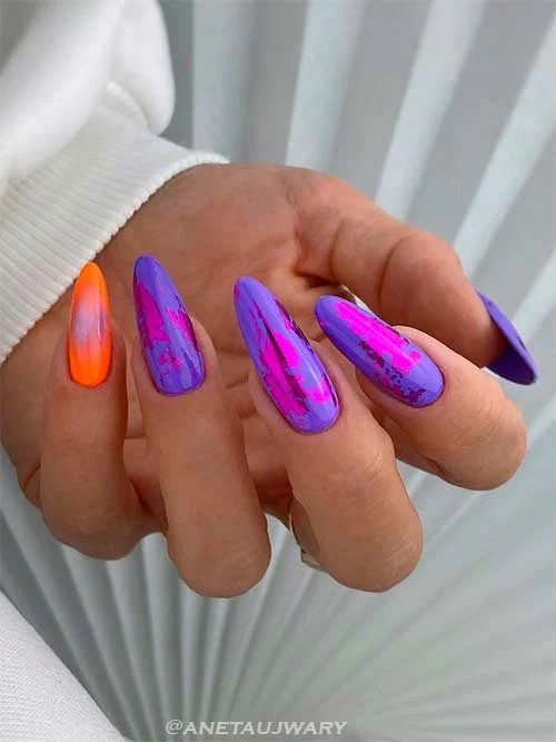 Літо – це найкращий час, щоб використовувати в нейл-арті найсміливіші та найяскравіші кольорові комбінації. Фіолетово-помаранчевий дизайн, безумовно, відноситься до одних із них. Він чудово виглядатиме практично з будь-яким вбранням. В якості декору можна використовувати рожеву перекладну фольгу. Такий манікюр ідеально поєднується з масивними прикрасами – кільцями та браслетами.