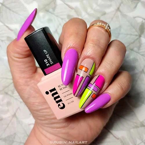 Один із наймодніших варіантів літнього манікюру – фіолетові нігті з геометричними кольоровими блоками. Цей нейл-арт підходить для будь-якого віку. Він вдало доповнить вечірнє вбрання або веселий, грайливий образ для вечірки.