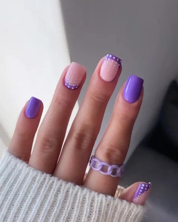 Щоб створити цей лаконічний та стильний дизайн нігтів, достатньо озброїтися лаками двох кольорів (білим та фіолетовим) та дотсом.