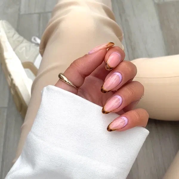 Ще один анімалістичний принт, який не втрачає своєї популярності, – леопардовий. У цьому нейл-арті він представлений у вигляді витончених французьких кінчиків. Доповнюють дизайн ніжні фіолетові лунки.