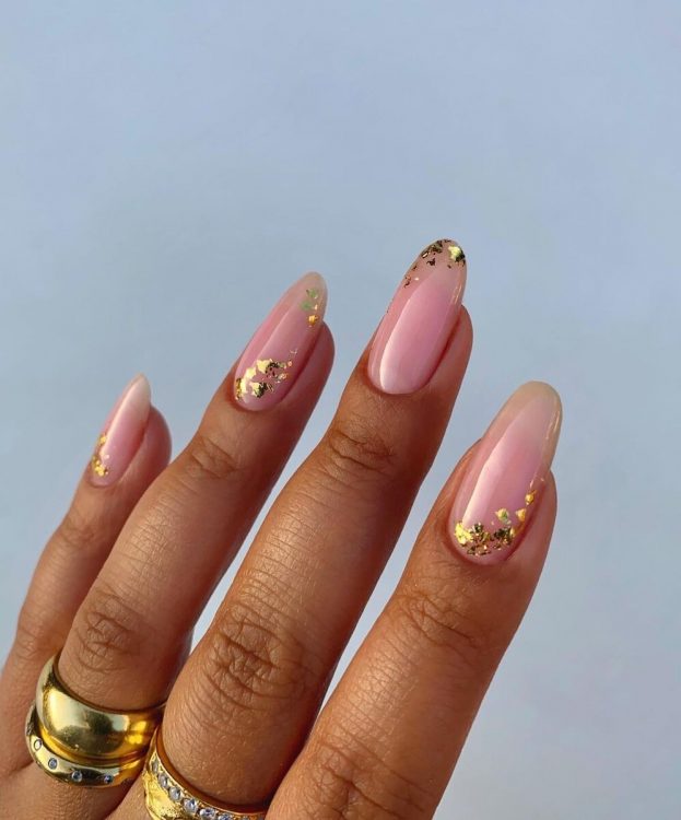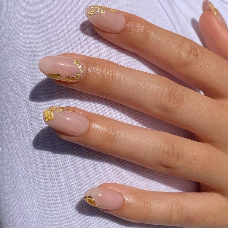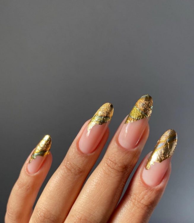 Ще один «багатий» та «шляхетний» колір — золотий. Його у манікюрі можна використовувати по-різному. Металеві варіанти втирання та фольга допоможуть створити максимально натуральну імітацію золота, а глітер — зробить дизайн більш святковим та новорічним. Спробуйте об’єднати золоті елементи з будь-яким із кольорів зі списку вище: не знаємо, чи допоможе це посилити їхню енергію, але в манікюрі таке поєднання точно виглядатиме ефектно.