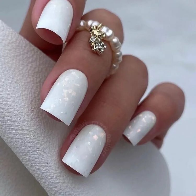 Для тих, хто любить додати в манікюр трохи мерехтіння без надмірного блиску, цей дизайн нігтів з пластівцями юки, що делікатно переливаються, на білому тлі стане прекрасним вибором. Він дуже простий у виконанні, але це не позбавляє його ефектності.