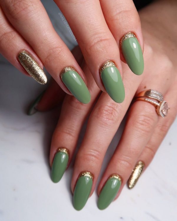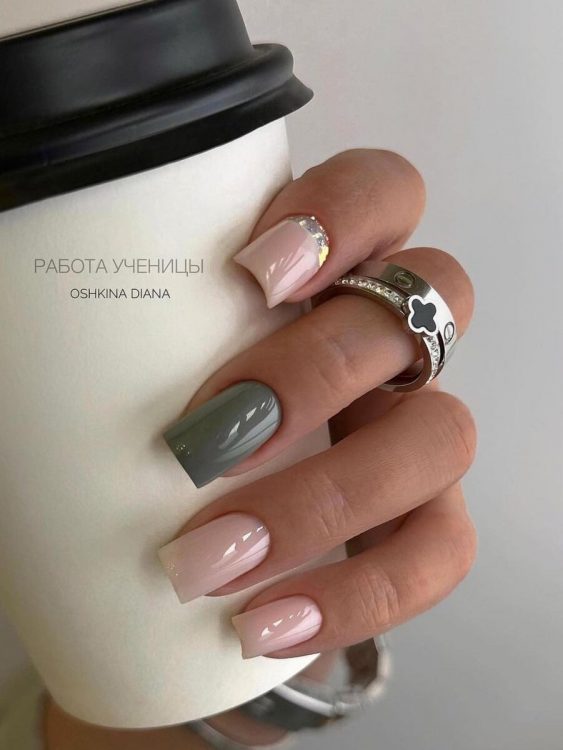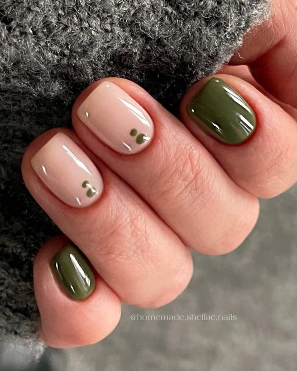 Цей манікюр виглядає шикарно і вишукано: однотонне оливкове покриття чудово поєднується з глянсовими світло-бежевими нігтями з асиметричними французькими кінчиками зеленого кольору. Такий дизайн ідеально підходить для осінніх та зимових місяців.