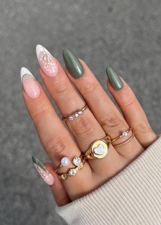 Ніжно-рожеві нігті, прикрашені білими французькими кінчиками та гілочками гіпсофіли, чудово виглядають у комбінації з однотонними оливковими нігтями.
