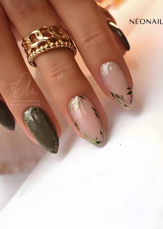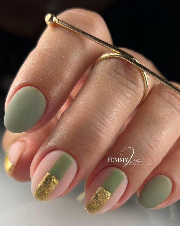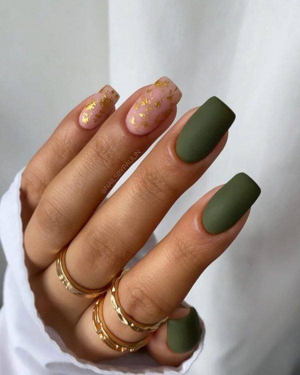 Темно-оливковий колір красиво контрастує з нюдовим покриттям, прикрашеним блискучою золотою поталлю, створюючи ефектний та привабливий образ. Матовий топ надає манікюру глибини та м’якості.