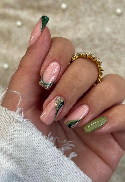 Цей манікюр включає кілька різних видів дизайну, з якими ви можете експериментувати, по-різному поєднуючи їх. Блідо-рожеву основу можна прикрасити французькими кінчиками із золотих блискіток або оливково-зеленими та золотими завитками.