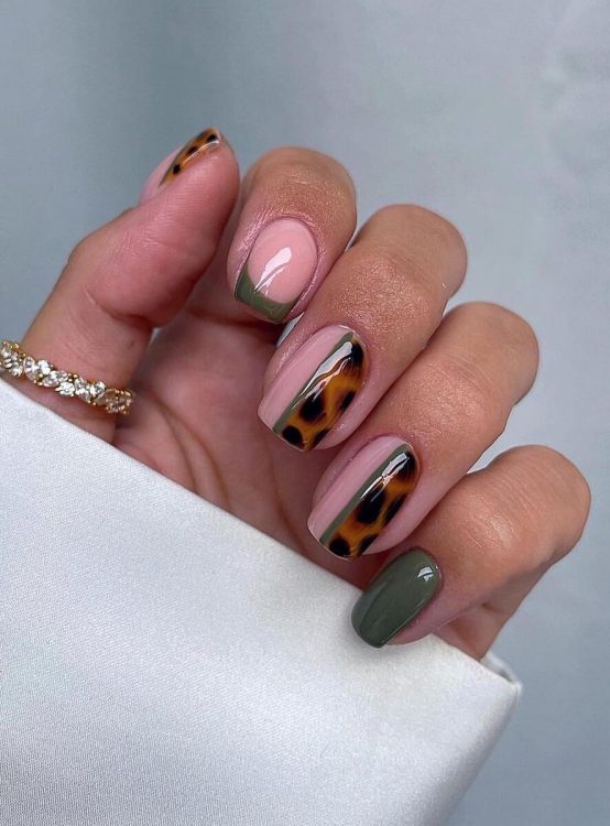 Черепаховий принт завжди користується популярністю. То чому б не поєднати його з оливковим кольором? У цьому манікюрі два середні нігті кожної руки розділені навпіл зеленою лінією. Одна половина покрита нюдовим лаком, а інша прикрашена черепаховим принтом.