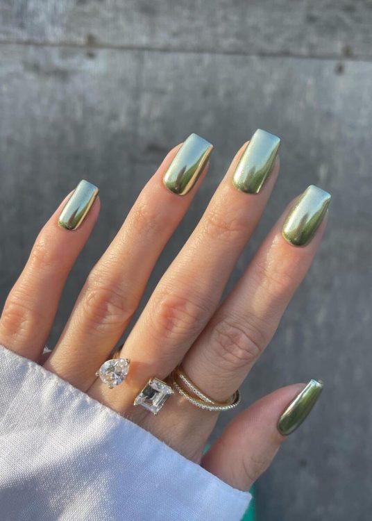 Додайте трохи сяйва у свій повсякденний образ за допомогою цього ефектного хромованого оливкового манікюру. Вам не потрібно малювати складні візерунки або використовувати акценти у вигляді стразів, щоб привернути увагу до своїх нігтів. Гарний металевий лак чудово впорається із цим завданням.