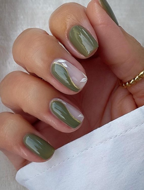 Цей манікюр із зеленими хвилями та мінімалістичним білим листям – витончений і жіночний. Оливковий колір чудово поєднується з молочним, а хвилі з блискучим контуром надають дизайну динамічності.