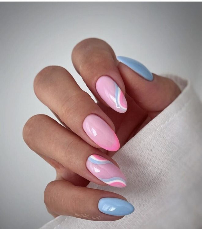 Рожевий колір чудово поєднується з пастельним блакитним і такий дизайн нігтів у весняний сезон досить популярний, особливо в мінімалістичних комбінаціях.