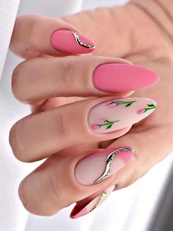 Рожевий колір незмінно асоціюється з ніжними квітами, що розпускаються навесні та влітку, тому нейл-арт у рожевих тонах з додаванням рослинного орнаменту настільки затребуваний кожного теплого сезону.