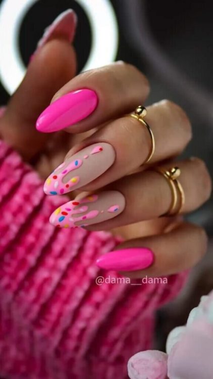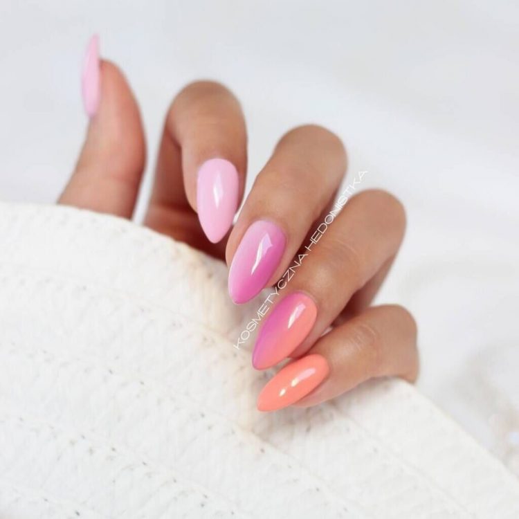 Рожеві відтінки чудово комбінуються з помаранчевим та персиковим – такий дизайн нігтів можна сміливо назвати по-справжньому яскравим та весняним.