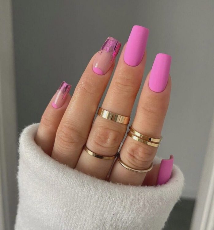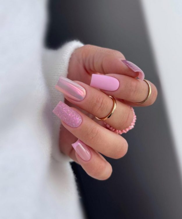 Для створення неймовірно ефектного, але при цьому ніжного нейл-арту можна поєднати одразу кілька технік нанесення манікюру, кілька рожевих відтінків та текстур (глянець+матовість).