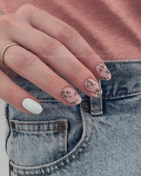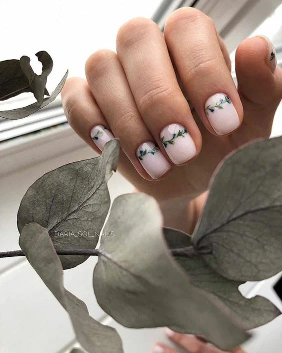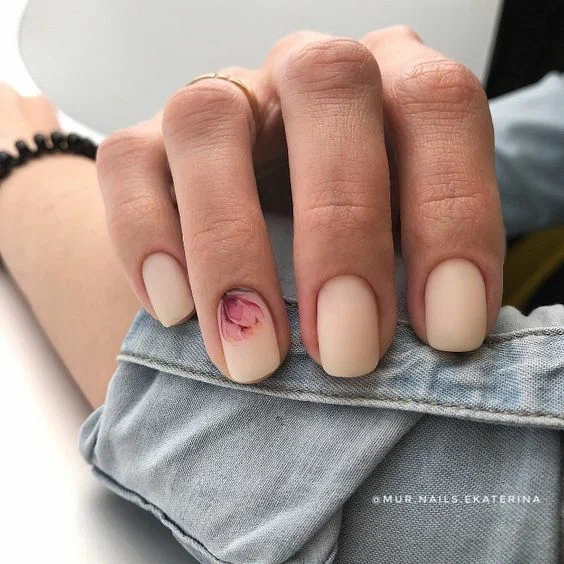 Матовий нюд + квітковий малюнок, виконаний в акварельній техніці – ще один чудовий тренд, який просто неможливо залишити без уваги. На матовому фоні витончені стебла квітів і пишні бутони виглядають запаморочливо. Квіткові малюнки – це ідеальний варіант для весняно-літнього манікюру.