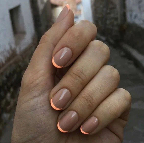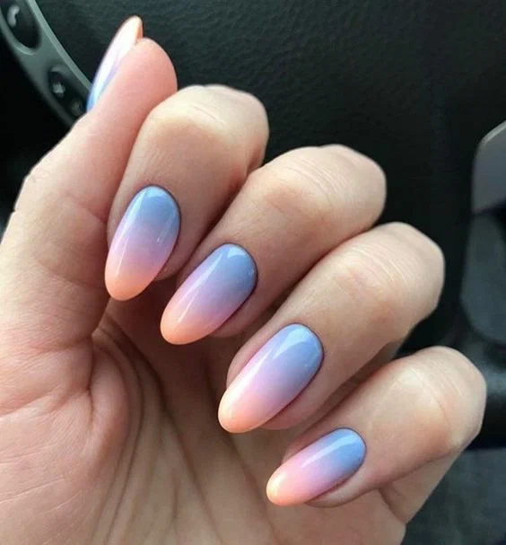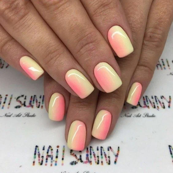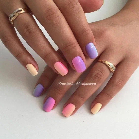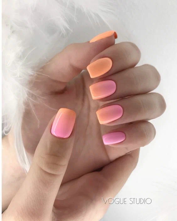 Легкий перехід від рожевого до помаранчевого виглядає гармонійно та по-весняному. Також користуються популярністю наступні колірні комбінації: рожевий + блакитний, жовтий + помаранчевий, блакитний + бірюзовий і, навіть, райдужний манікюр, який може включати три і більше відтінків одночасно з плавним переходом.