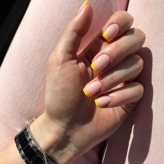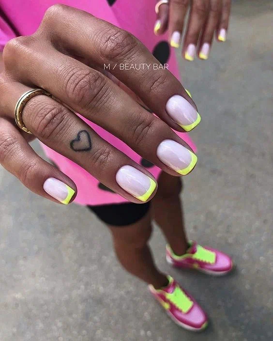 Яскравий французький манікюр чудово виглядає як на довгих, так і на коротких нігтях.