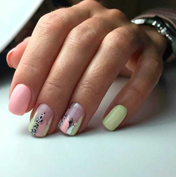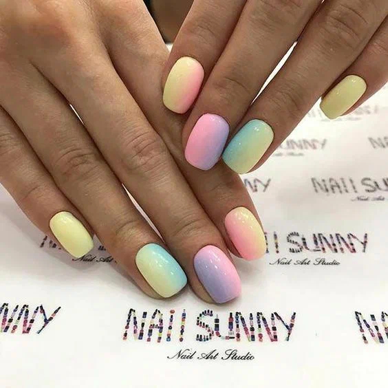 Перед вами ще один стильний варіант манікюру, цей дизайн можна назвати «райдужним». Нейл майстри пропонують навесні віддавати свою перевагу приглушеним пастельним відтінкам, вони чудово перегукуються між собою і роблять жіночі ручки доглянутими і охайними.