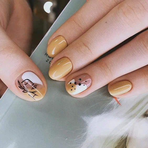 Щоб ручки виділялися і виглядали доглянуто, манікюр можна доповнити яскравими акцентами – пофарбувавши кілька нігтів у однотонний строкатий колір. Глянцевий фініш додасть манікюру завершеності та родзинки.
