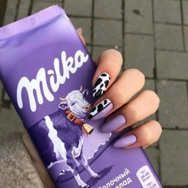 Ніжний фіолетовий колір перетворює легковажний і дівочий коров’ячий принт на стильний і благородний нейл-арт.
