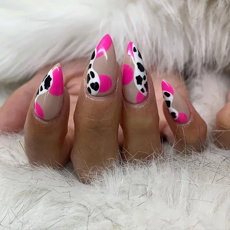 Для створення цього нейл-арту просто розділіть нігті навпіл, а потім одну половину покрийте світло-рожевим лаком, а на іншій намалюйте коров’ячі плями.