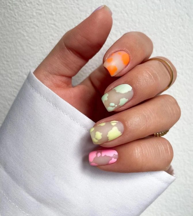 Виділіться з натовпу за допомогою цього креативного нейл-арту з коров’ячим принтом та хвилястими візерунками у рожевому, синьому та помаранчевому кольорі.