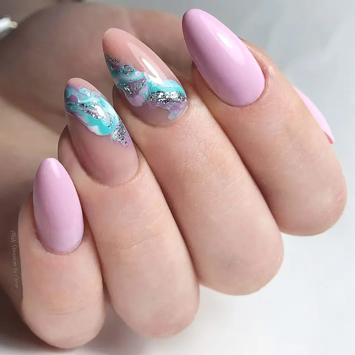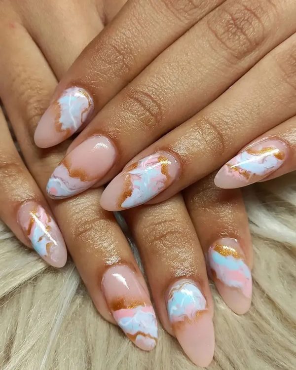 Незвичайний мармуровий манікюр на довгих мигдалеподібних нігтях