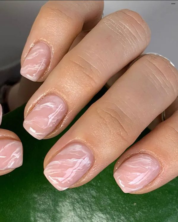 Нейтральний мармуровий манікюр на коротких квадратних нігтях