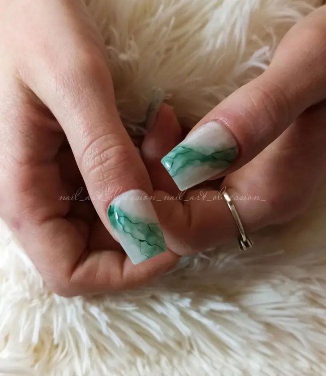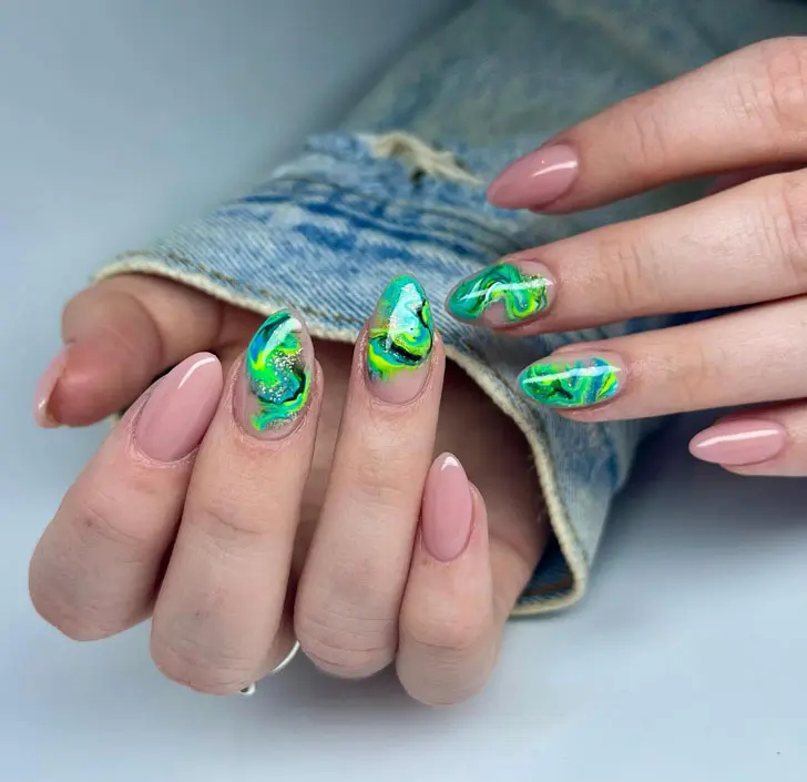 Яскравий зелений манікюр із мармуровим принтом