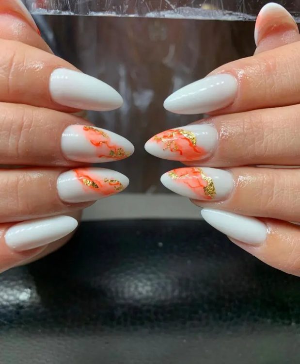Надзвичайно елегантний білий мармуровий манікюр з помаранчевими хвилями та золотими пластівцями