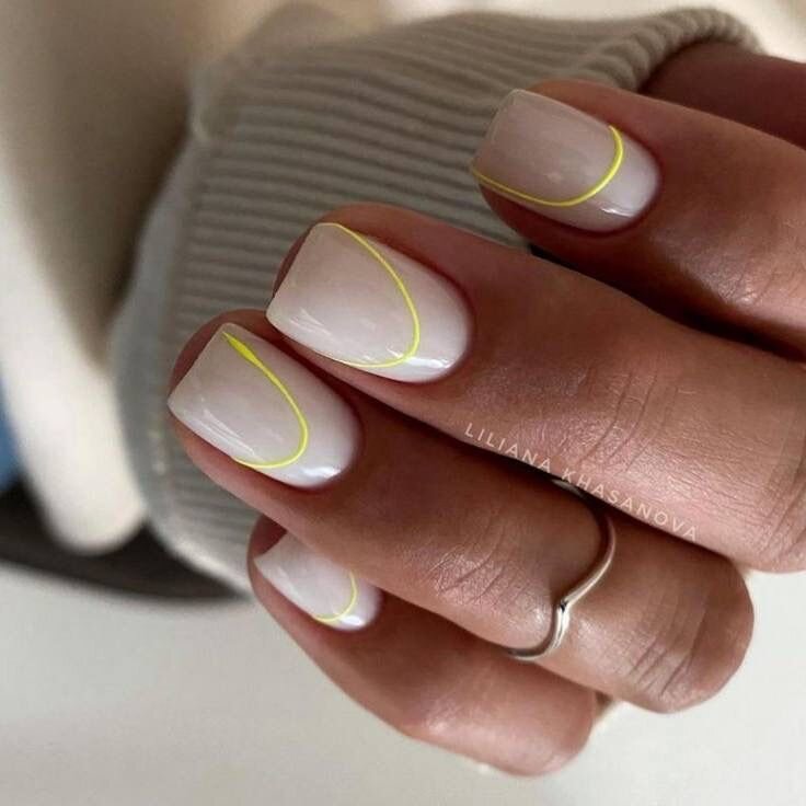 Цей ультрамодний дизайн нігтів поєднує в собі нейтральну основу та яскраві тонкі лінії. Такий мінімалістичний нейл-арт дуже універсальний та легко може бути адаптований під ваш індивідуальний стиль. Просто намалюйте на кожному нігті пряму лінію, використовуючи неоновий лак, і ви будете вражені тому, наскільки ефектним буде цей простий за своєю ідеєю манікюр.