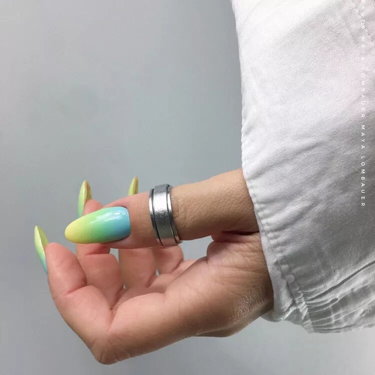 Цей дизайн привертає увагу тим, що в ньому поєднуються найрізноманітніші неонові відтінки – від яскраво-блакитної основи до м’ятно-зеленої середини та пастельно-жовтих кінчиків.
