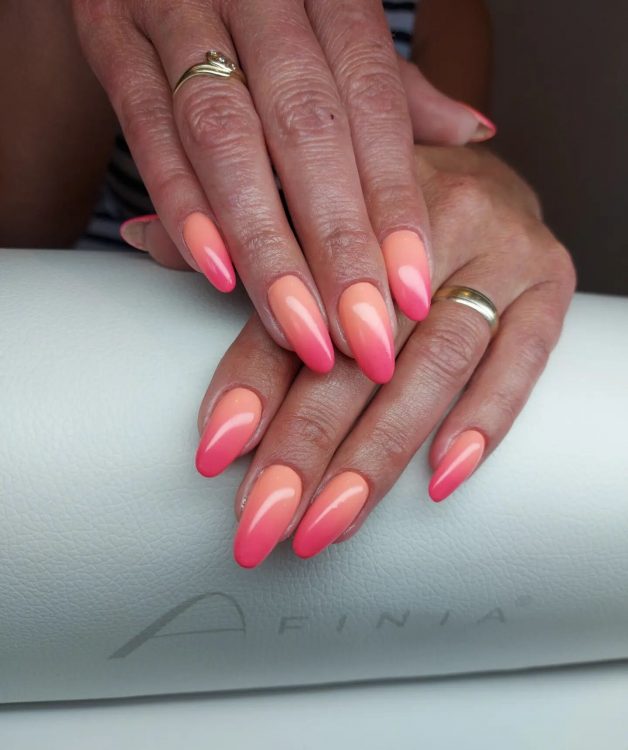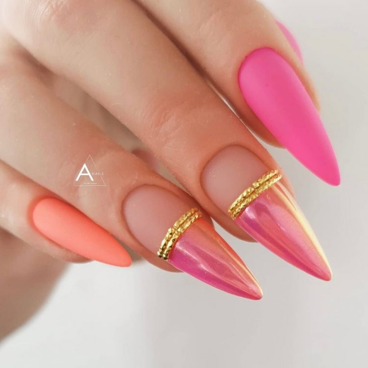 Поєднання помаранчевого та рожевого нагадує про теплі літні заходи сонця. Манікюр у цих ніжних відтінках ідеально підійде всім представницям прекрасної статі, які віддають перевагу яскравому дизайну нігтів.