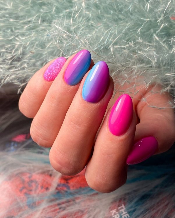 Яскравий манікюр у фіолетово-рожевих тонах – оптимальний вибір для любительок вечірок. Додайте в дизайн трохи блискіток, щоб стати головною зіркою вечора.