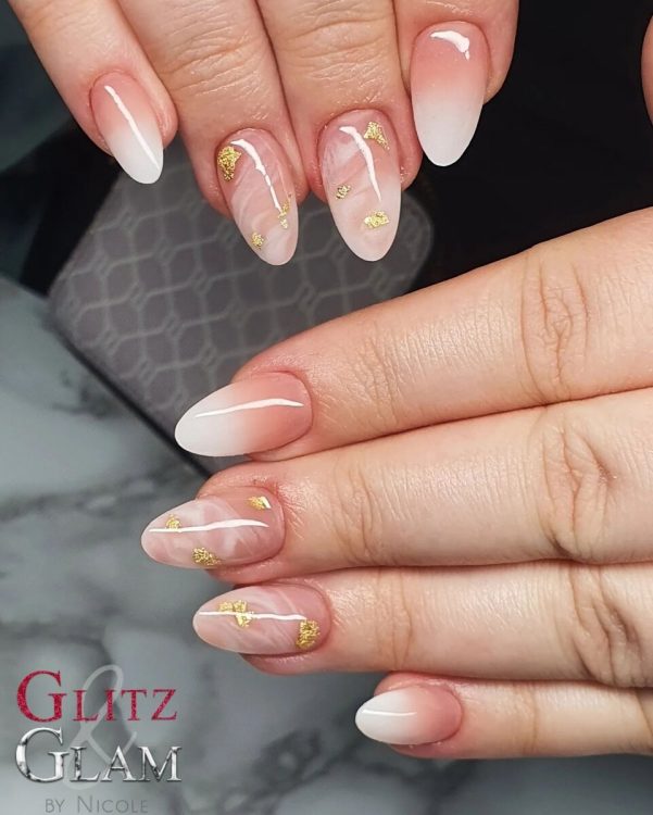 Витончений манікюр нюдового кольору з невагомими мармуровими розводами, золотою поталлю та легким ефектом омбре підійде під будь-який образ та стиль. З ним можна вирушити як до офісу, так і на урочистий захід.