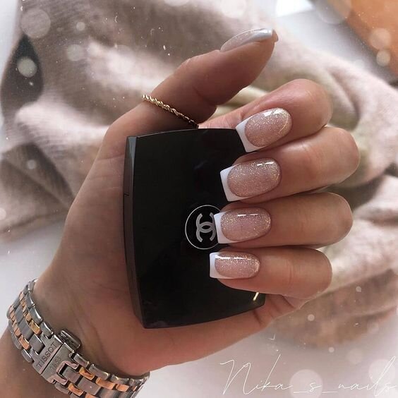 Шляхетний та класичний французький манікюр з ніжними блискітками – також знаходиться на піку популярності. Завдяки легкому мерехтінню французький манікюр виглядає святково та виразно, цей варіант чудово підійде для урочистих заходів, а також на щодень.