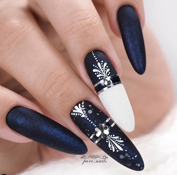 Новорічний манікюр може бути не лише у білих та блискучих кольорах лаку, а й у витонченому синьому кольорі. Такий благородний відтінок дозволить висловити бездоганний смак жінки, а також стане чудовим полотном для розпису новорічної тематики.