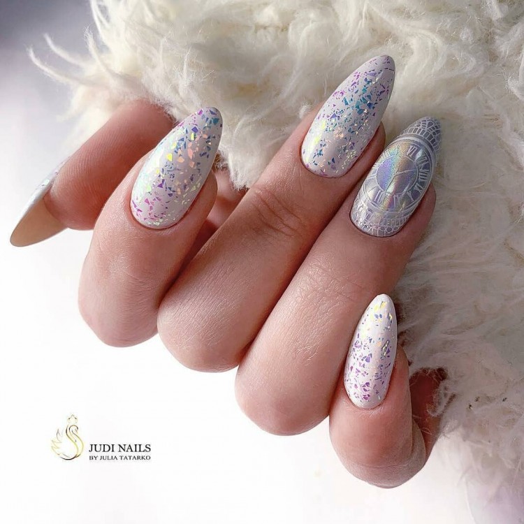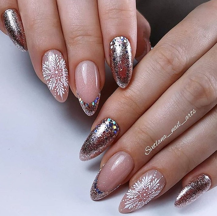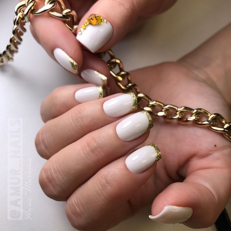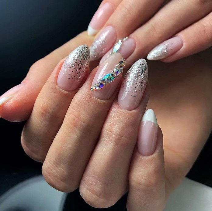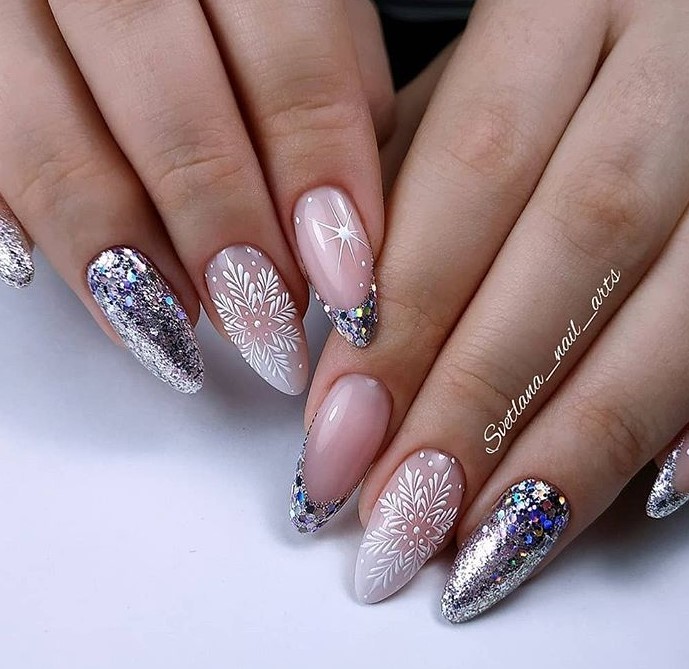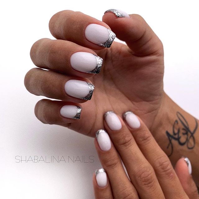 Манікюр справжньої снігової королеви можна зробити за допомогою стразів у вигляді битого скла. Його не потрібно додавати на всі нігті, а бажано зробити акцент на одному пальчику. Інші нігті можна прикрасити розсипом блискіток разом із французьким манікюром.