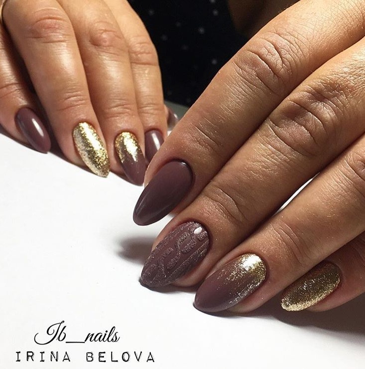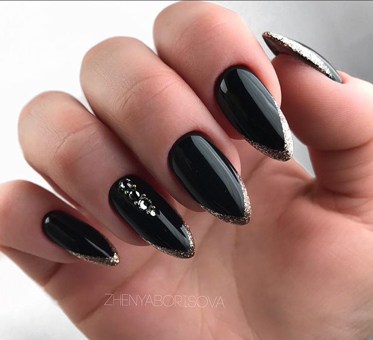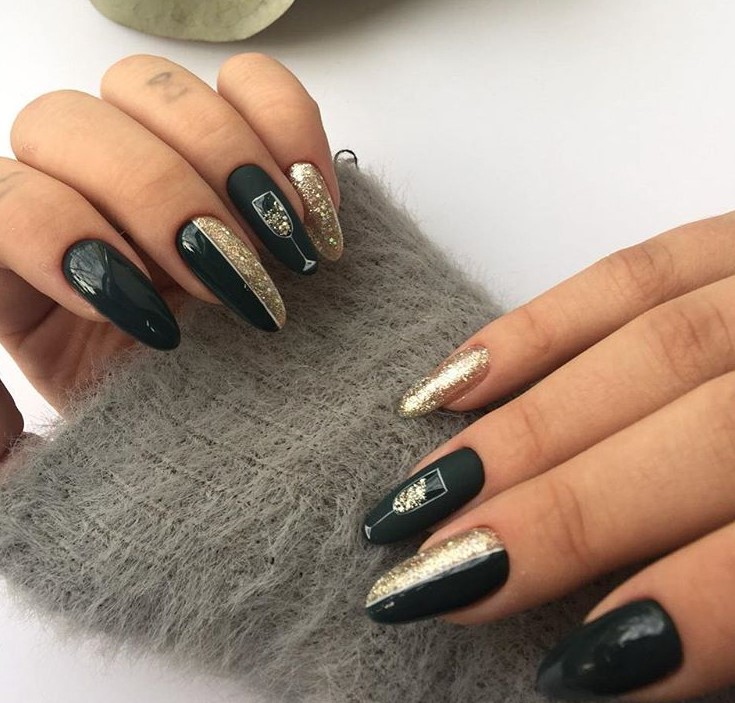 Для витончених жінок, які люблять темні відтінки манікюру, підійде контрастний дизайн із чорним та золотим оформленням. Більш оригінально виглядає манікюр, в якому на одному нігті представлені два яскраві кольори. Щоб дизайн підійшов для новорічного корпоративу, можна намалювати кілька келихів ігристого вина на одному чи двох пальчиках.