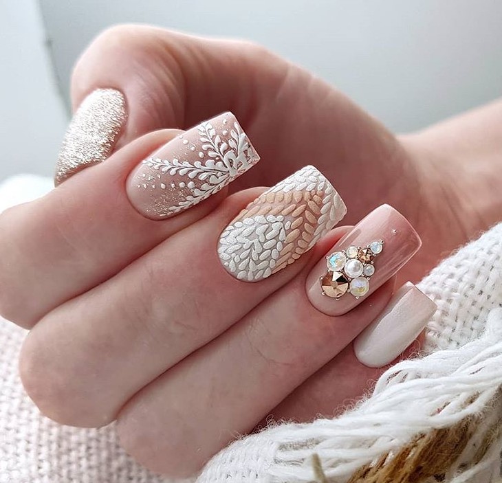 Чудові сніжинки на всій області нігтя можуть прикрасити ваш образ і зробити його по-справжньому чарівним. Не забудьте зробити акцент на одному пальчику за допомогою яскравих стразів. Також оригінально виглядає об’ємний малюнок, покритий матовим оздобленням.
