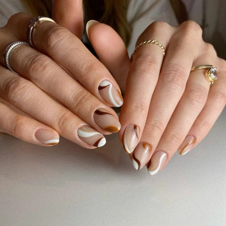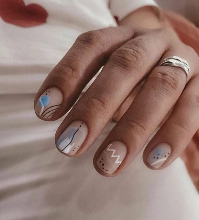Нюдові відтінки лаку та абстракція відмінно поєднуються один з одним. При цьому абстрактні малюнки виглядають стильнішими, а нюдовий колір вони навіть в чомусь пожвавлюють.